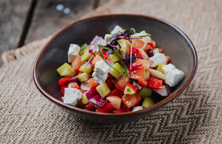rajčica, krastavac, ljubičasti luk, paprika, miso dressing / Alergeni – gluten, soja, sezam, plodovi mora